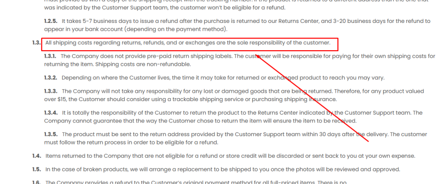 Isso significa: se algo correr mal e quiser o seu dinheiro de volta ou a troca, terá de suportar os custos. Um sinal de alerta clássico no manual das lojas de burlas.