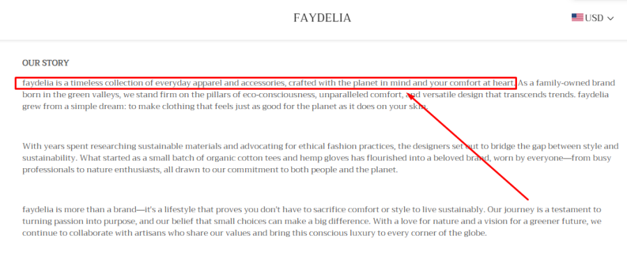 One of the first red flags on Faydelia.com is its About Us page. The site claims it “is a timeless collection of everyday apparel and accessories.” Sounds fine, right?