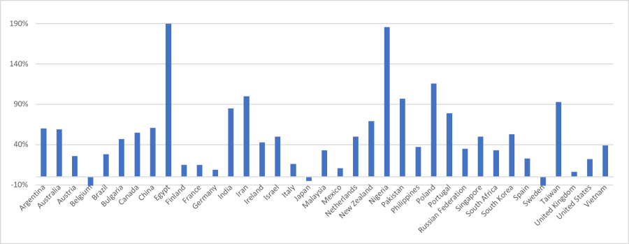 While the definitions and reporting methods used by different countries for scams differ strongly, nearly all nations have reported large increases in the number of reported scams. Egypt (190%) and Nigeria (186%) reported the most dramatic increase in the number of scams. Other developing countries such as Iran, India and Pakistan also reported strong growth in the number of scams of around 90% as the population massively moved to the internet. Only a few countries reported minor decreases including Belgium, Japan, and Sweden.