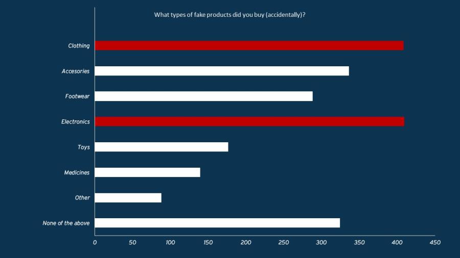Still, 70% of the consumers have bought a fake product in the past unknowingly or doubting the originality of the product. 21% admit to knowingly having bought fakes. Clothing, electronics and accessories are the most commonly purchased fake products.